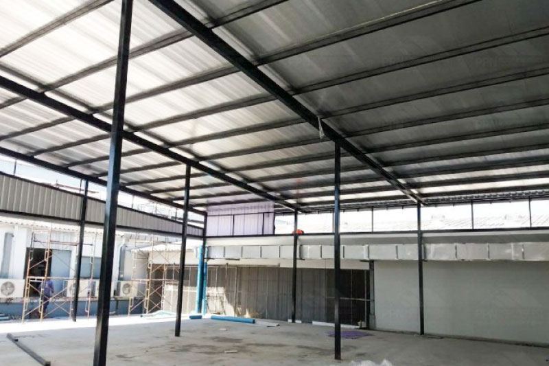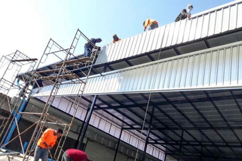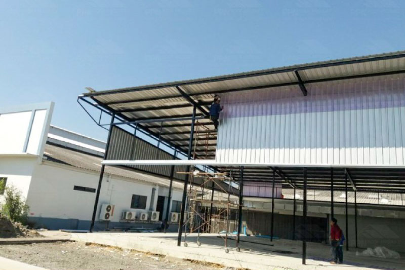 งานติดตั้งแผ่นหลังคาชนิดอลูซิงค์ ความหนา 0.40 มม (เหล็กบลูสโคป) ติดฉนวนกันความร้อน PU Foam ความหนา 1 นิ้ว และปิดทับด้วยอลูมิเนียมฟอยล์