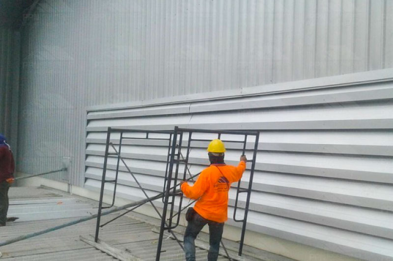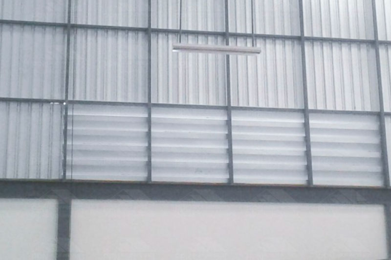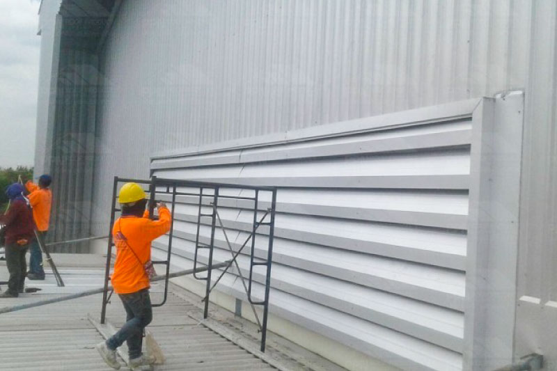 เจาะผนังเมทัลชีทเดิมออก และเสริมโครงเหล็กเพื่อติดเกล็ดระบายลมเมทัลชีท โดยใช้แผ่นเมทัลชีทอลูซิงค์ ความหนา 0.47 มม. (เหล็กบลูสโคป) มารีดขึ้นรูปเป็นเกล็ดระบายลม ขนาดมาตรฐาน Louver A G.457